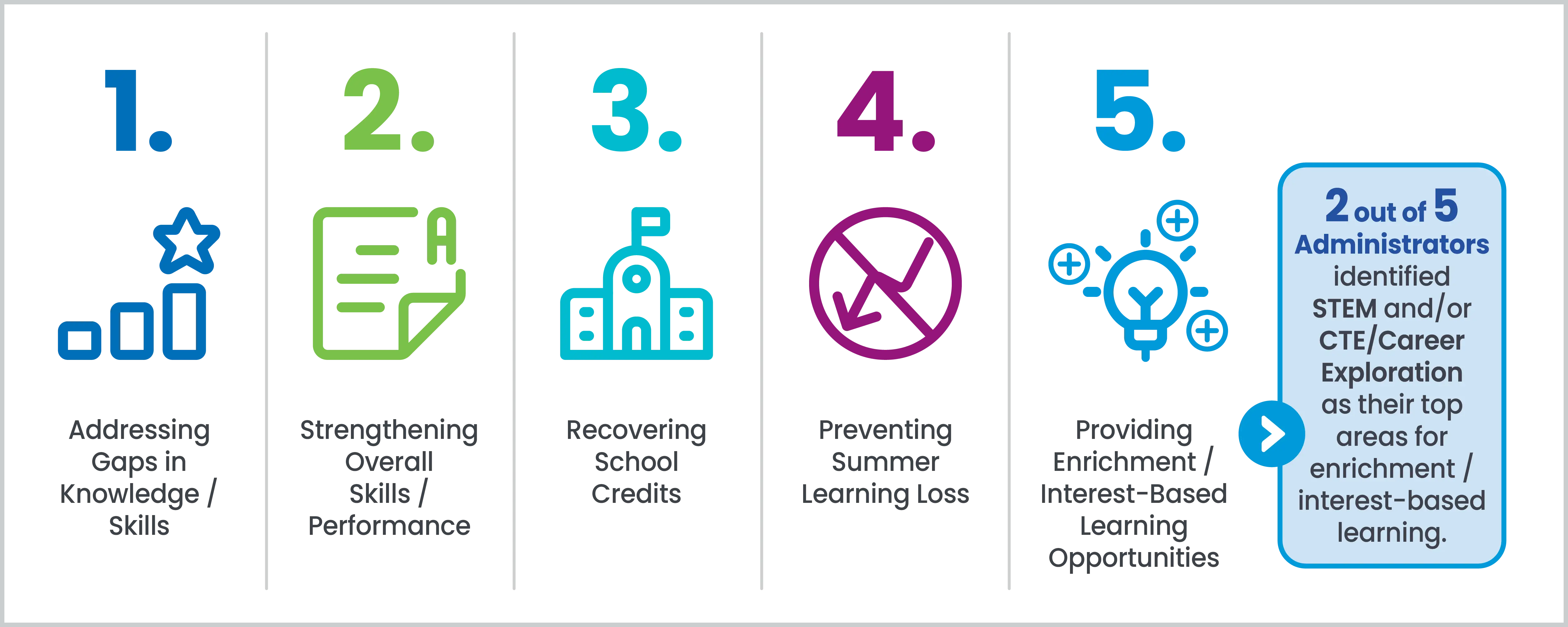 Extending learning time to students still struggling to reach proficiency continues to be a top goal for summer programs, according to a recent nationwide Savvas survey of school and district administrators. Here are administrators’ top five goals for summer learning programs: addressing students' gaps in knowledge or skills; strengthening students' overall academic skills and performance; recovering school credits; preventing summer learning loss; and providing enrichment and interest-based learning opportunities beyond core academics. In addition, two out of five administrators identified STEM and/or CTE/career exploration as their top areas for enrichment and interest-based learning.