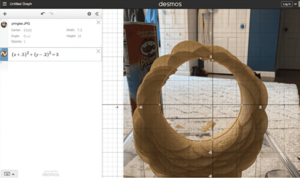 Many teachers are already using Desmos as an integral part of their instruction. In addition to regular lessons, I have also been using Desmos as the means to facilitate #MathPlay for my students. A key component of effective #MathPlay is providing students with some level of choice and multiple pathways to complete the activity. One example that comes to mind was an art project I gave my students after we finished our conic sections unit. I had them recreate a scene from a favorite movie/show/book using Desmos and I was blown away with the quality of their work. Another activity my students really enjoyed was building a circle out of Pringles, taking a picture of it, and finding an equation for the circle in Desmos. I know it’s not always easy or possible to do these types of activities, but I bet we can all find at least one opportunity per unit of study.