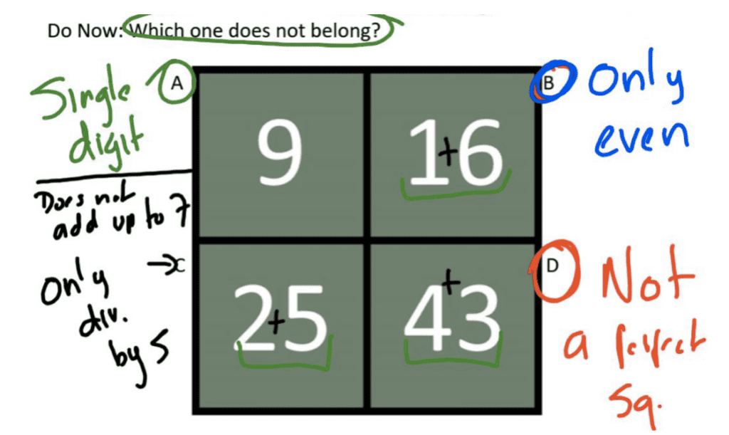 At the beginning of the school year, I noticed that my remote students were not participating as much as I wanted them to. Their cameras were on and I could tell they were taking notes, but it all felt very passive. I decided then to start class with a “Which One Does Not Belong Question”, in which, students have to make a choice among four possible options. The beauty of the problem is that an argument can be made for each choice, so it hooks students into sharing and participating. After a couple of weeks, students were participating more and there was a lot more interaction between students in person and students at home.