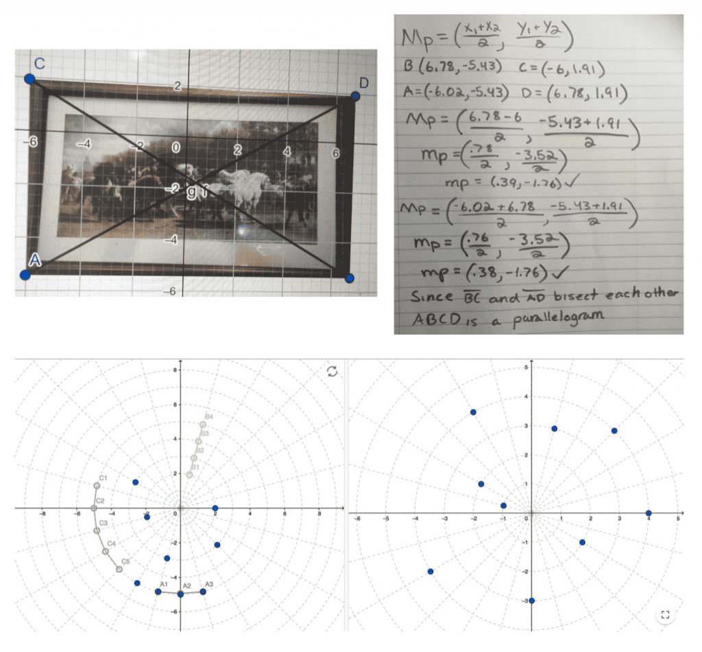 Another fantastic platform for math teachers to use is Geogebra. As a math educator and learner, I really enjoy Geogebra’s capability to help visualize abstract math concepts. Similar to Desmos, it is a very intuitive and user-friendly site for both teachers and students. Pictured below are two recent examples that come to mind from my geometry and precalculus classes. I asked my geometry students to take a picture of something that looked like a parallelogram in their home and then use Geogebra to prove or disprove that it was a parallelogram. It was not only engaging to my students but it also provided them with an opportunity to get up and move around. Also, earlier this school year when we were starting polar coordinates, I had my students play a game of “battleship” using polar coordinate via Geogebra. One major benefit was that students that were in person that day were able to play and interact with the remote students.