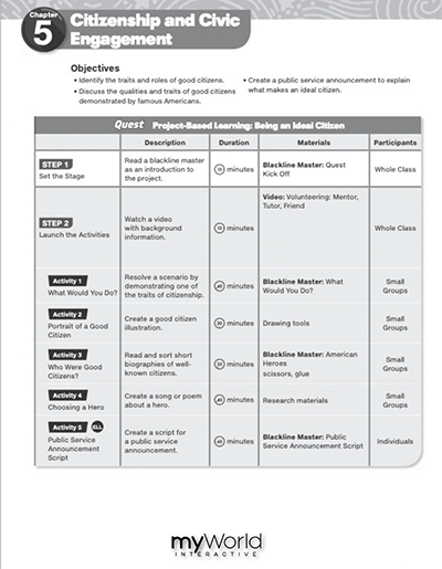myWorld Interactive from Savvas features inquiry projects called Quests that support students in discovering answers to each chapter’s Big Question. In this inquiry activity from myWorld Interactive, students will complete a series of activities as they go through a Quest to unlock their answers to “What is an Ideal Citizen?” First, have the students watch this video, then continue with the activity.