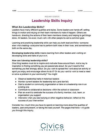 In this inquiry activity from Civics Interactive, students will explore different leadership skills and styles. They will have the opportunity to go through various activities to ultimately plan and execute a leadership project of their choosing. Use the linked guide to take your students on this Inquiry Journey.